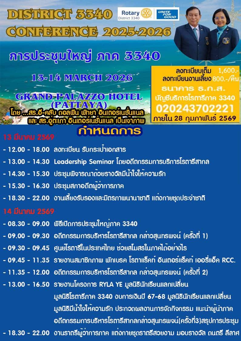 Mark your calendars for March 13–14, 2026, and get ready to gather with your fellow Rotarians in the vibrant city of Pattaya! We are thrilled to invite all members of Rotary District 3340 to our annual District Conference at the beautiful Grand Palazzo Hotel. This year’s conference is themed “Unite for Good,” reflecting Rotary’s 2025–26 call to action that emphasizes the power of unity and collaboration in achieving our goals of service and impact. In a world often divided, Rotary stands as a beacon of unity and hope, uniting us in a shared purpose: to do good in the world.